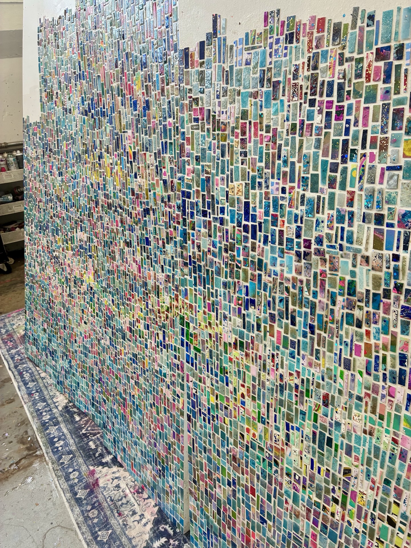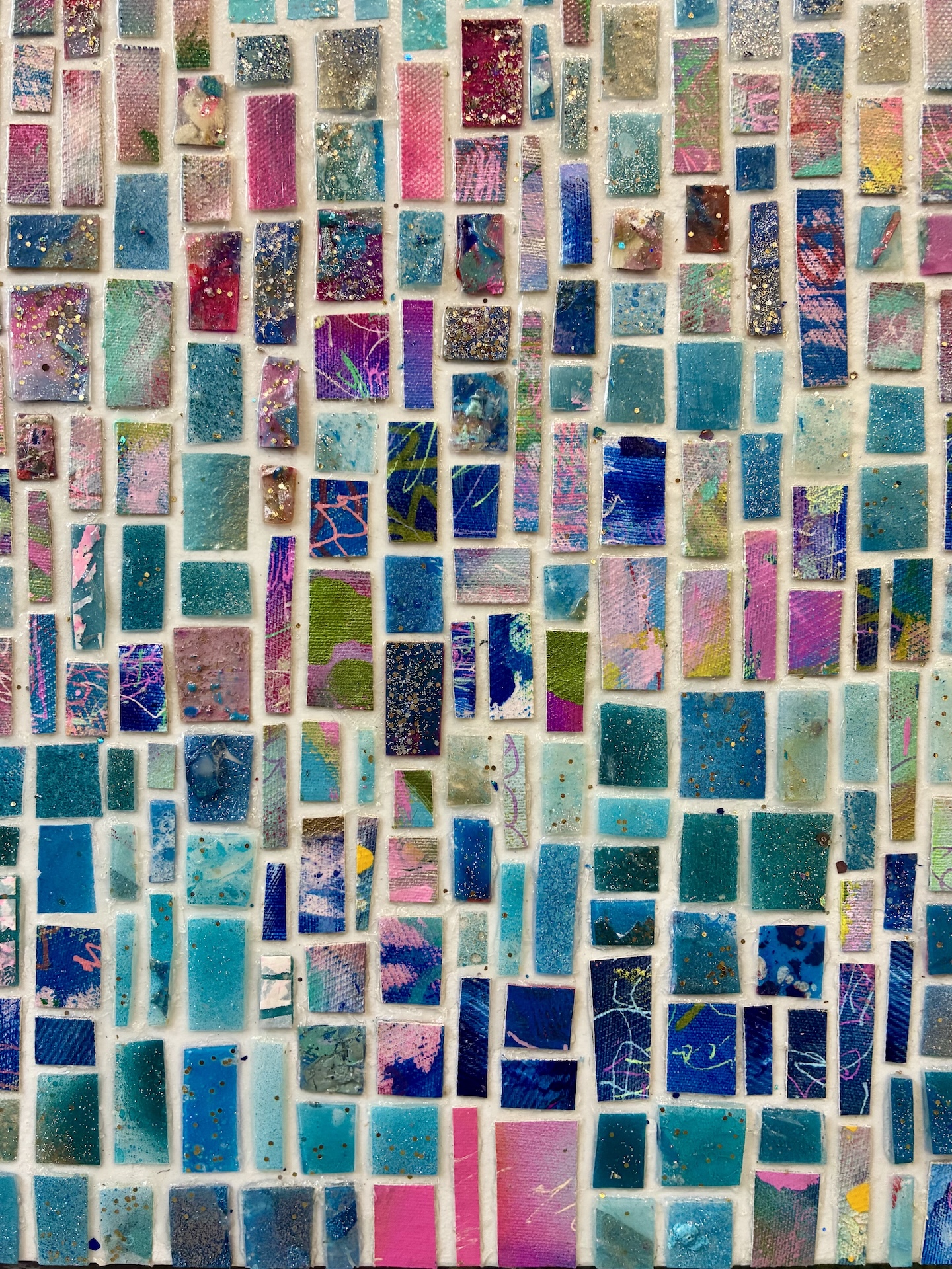 Courtney Kolker's mosaic, 6 Pillars (2025), transforms the six pillars inside Capital One Hall's logo into six sculptural pillars with unique tiles—the majority made by festival attendees during the 2025 Tephra Institute of Contemporary Arts Festival. Kolker's tiles feature recycled dried paint from the artist's studio and hand-created acrylic skins, or thin flexible sheets of paint. As a metaphor for growth, creativity, resilience, connection, innovation and community, 6 Pillars is intended to represent the merging of community voices.